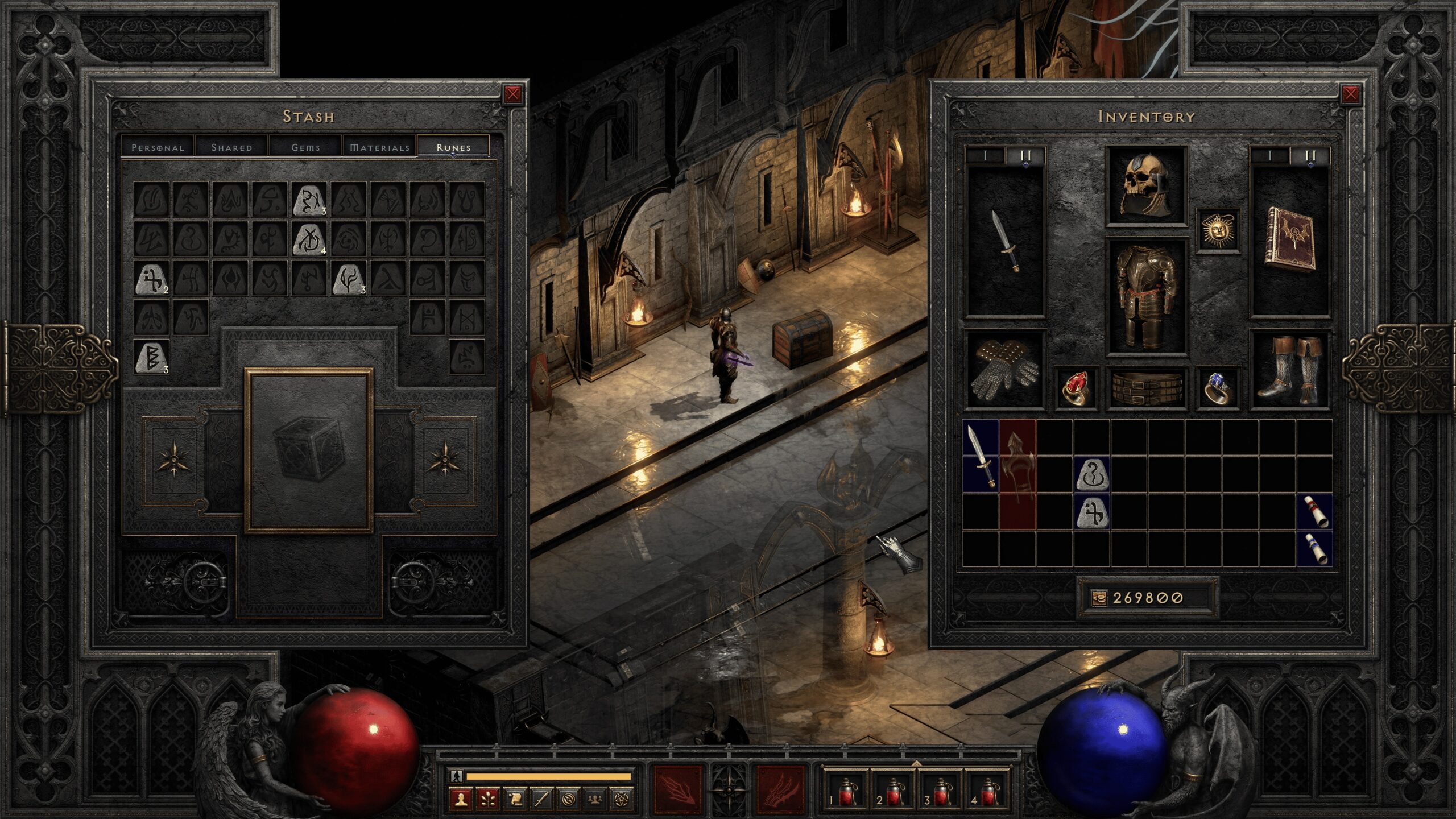 Uno de los cambios más celebrados no está en el combate, sino en la gestión del inventario. Ahora runas, gemas y materiales pueden apilarse en el cofre, liberando espacio y eliminando prácticas antiguas como crear personajes secundarios solo para almacenar objetos. A esto se suma un sistema de filtrado de botín que permite personalizar qué tipos de ítems aparecen en pantalla, facilitando la búsqueda de piezas clave y evitando la saturación visual en zonas con muchos enemigos.